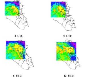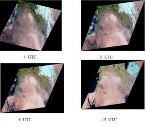 Figure (3) shows the satellite images after geometric correction process , resulting in images that read real coordinates and can be relied upon for various calculations. The correction process for the Meteosat-9 satellite images was based on a Terra-MODIS satellite image, which had a spatial resolution close to that of the images used in the study, with a spatial resolution of 1 km , where the error rate was a few in the correction operation as shown in table ( 2 ) .