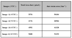 Table ( 4 ) shows the difference in the area of the dust storm during the four hours chosen for the study , that ʼs where the storm is at each image represents two types of concentration of dust ( light and heavy ) , so we notice that the storm area in the image is large because it represents the stage of rising dust particles ( light dust ) , but in the second and third images because it represents the intensity of the storm , while the fourth image increases the area of the storm because it reaches its suspended dust. Here, the research objective is achieved in two aspects: first, to calculate the area of the dust storm and its impact on the regions it passed through; And second, to deal with satellite images from the perspective that they are digital images requiring various digital processing techniques, something that was lacking in previous research that studied this phenomenon relying solely on the visual interpretation of satellite images.